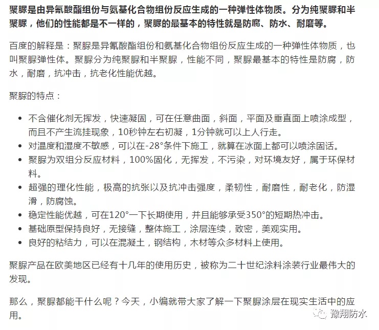 聚脲材料的防水性能非常優(yōu)越,噴涂后的聚脲形成一個(gè)整體類似橡膠層一樣的整體防水層,所以,水分根本進(jìn)不去。